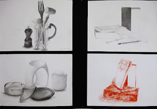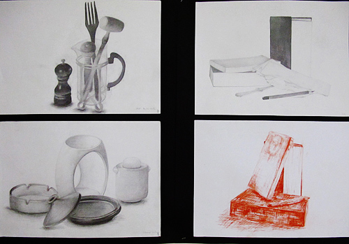 Desenho de observação de formas naturais e artificiais.Material utilizado grafites, lápis sanguinea e lápis de cor.