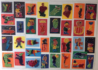 Depois do preenchimento ainda de algumas partes do desenho com linha (esferográfica), segue-se a fase do recorte e colagem de papel de lustro.